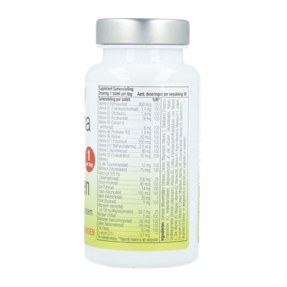 Ingrediënten: Vulmiddel (Microkristallijne Cellulose), Calcium, Magnesium, Vitamine C, Stabilisators (Povidone, Crospovidone XL), Antiklontermiddelen (Magnesiumzouten uit vrije vetzuren, Siliciumdioxide), Kalium, Verdikkingsmiddel (Vernette cellulosegom), Vitamine B3, Coating (Hydroxypropylmethylcellulose), IJzer, Vitamine E, Zink, Vitamine B5, Mangaan, Vitamine B2, Vitamine B6, Vitamine B1, Koper, Vitamine A, Vitamine B11, Jodium, Co-enzym Q10, Vitamine K, Seleen, Molybdeen, Vitamine B8, Chroompicolinaat, Vitamine D3, Vitamine B12.